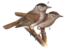 Sylvia atricapilla is greyish in colour with a distinctive black cap, not extending below the eye. It is about 14 cms long and is generally seen in woodland with undergrowth, thickets, hedges, orchards and gardens.